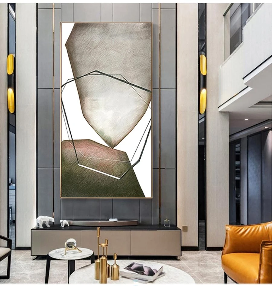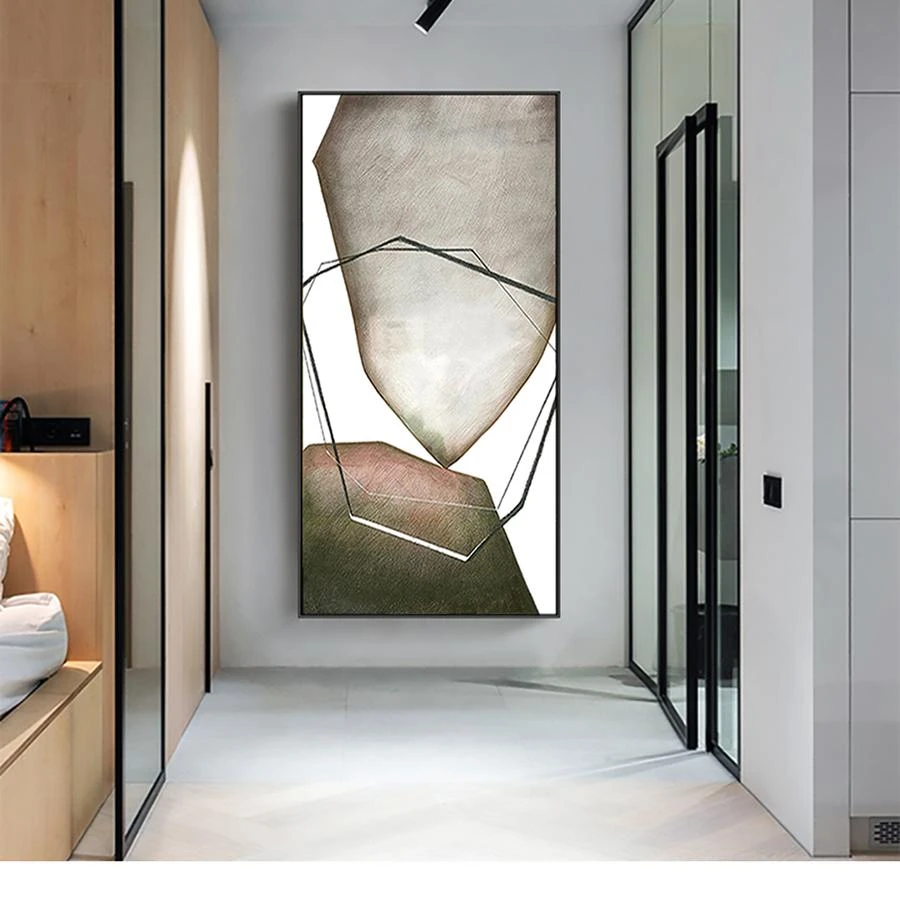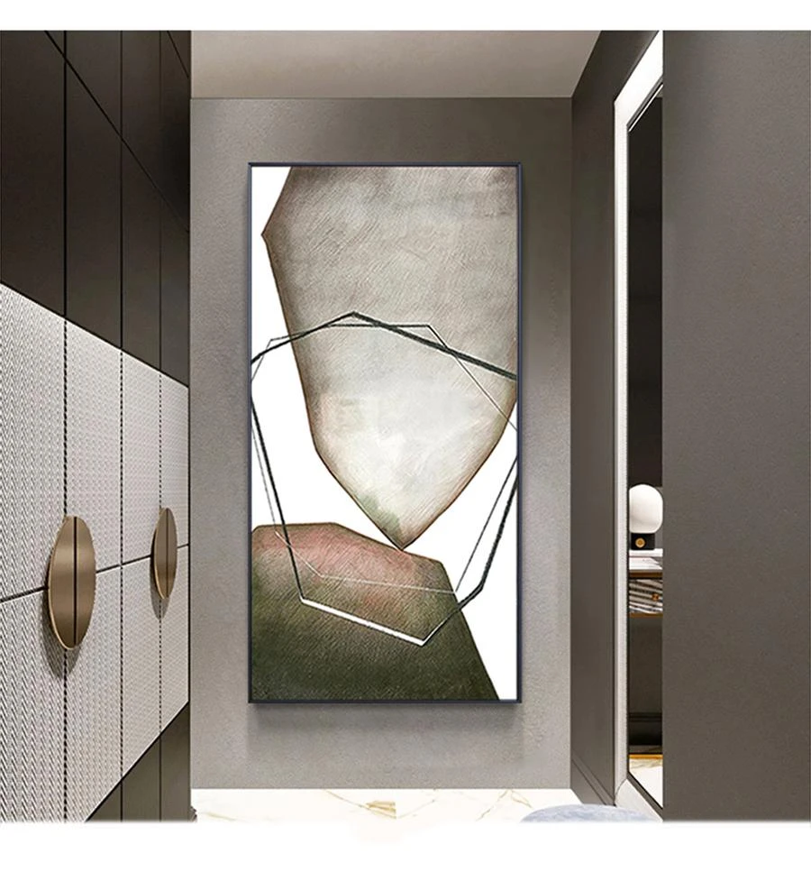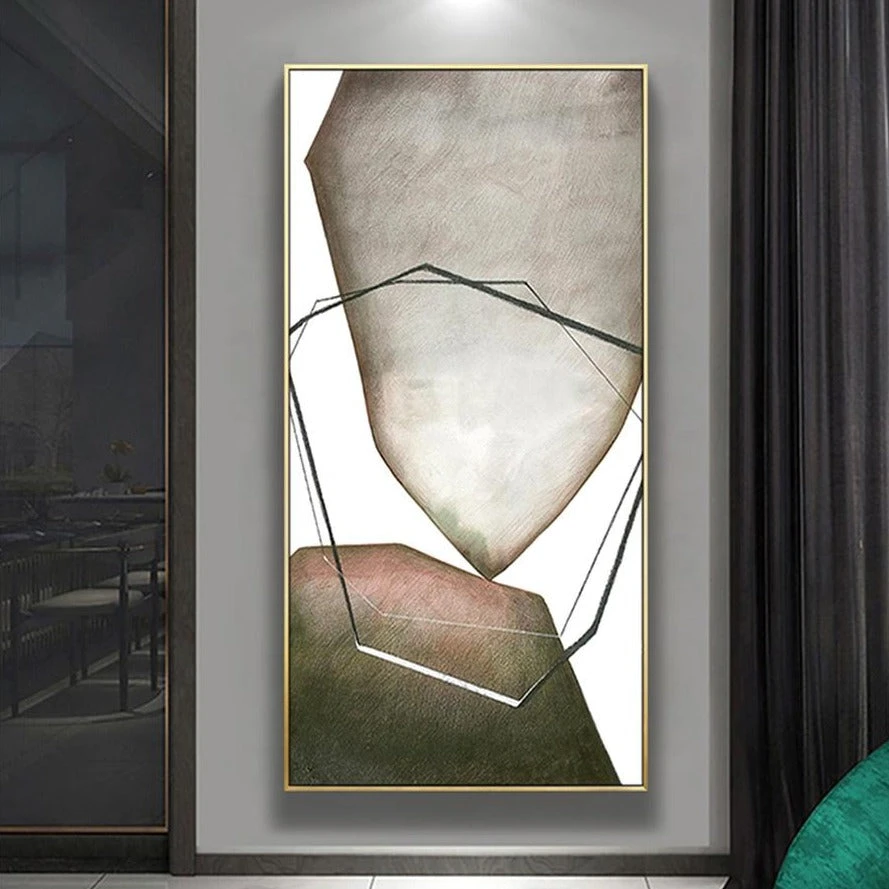 This abstract painting uses geometric shapes and soft colors to create a visually engaging piece. Its sleek design adds sophistication to any space, making it perfect for modern decor.